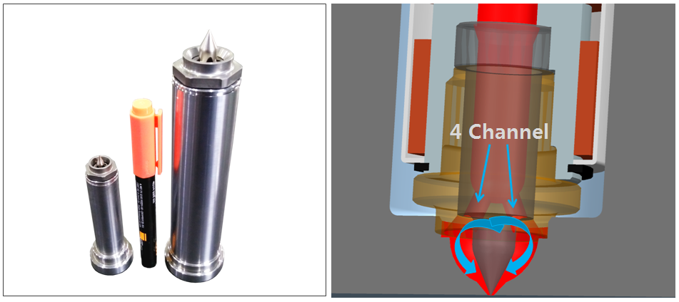 기존의 핫런너 Pin Point Type의 노즐들은 Tip에서 수지가 통과하는 Channel이 1개 또는 2~3개로 형성 되어 있으며,